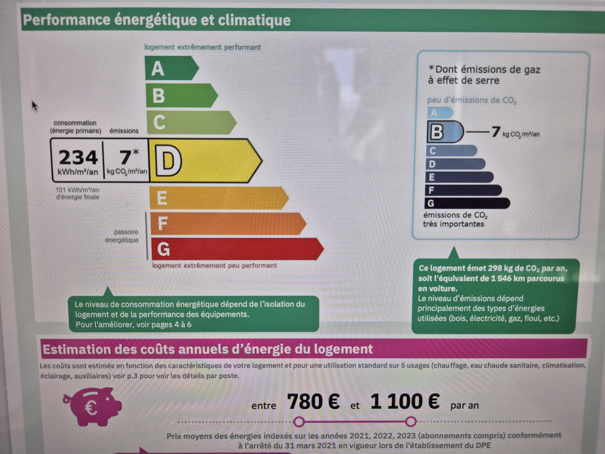 Montant estimé des dépenses annuelles d'énergie pour un usage standard est compris entre 780 € et 1 100 € . Prix moyens des énergies indexés sur les années 2021, 2022 et 2023 (abonnements compris).